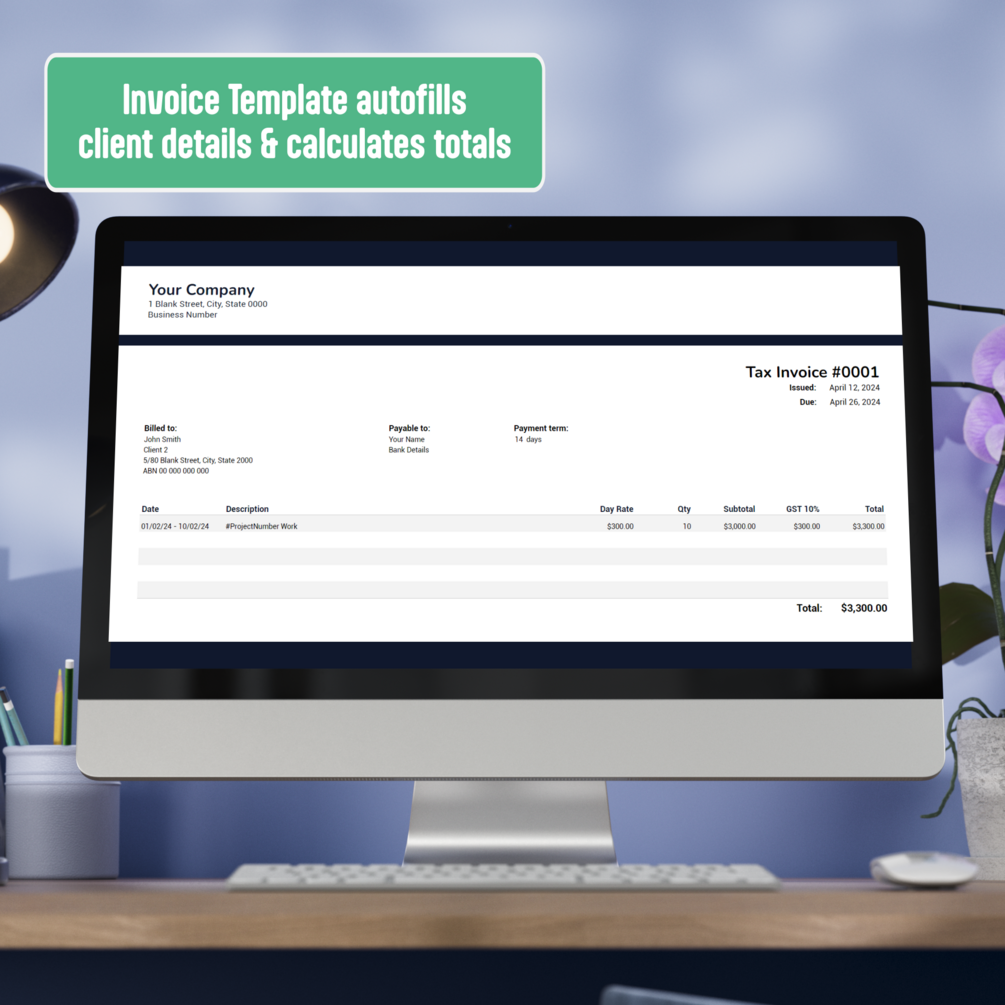 Invoice Template: Gathers information from your other pages to prefill client information to make invoice writing easy. Automatically sums up add ons and totals, and calculates the invoice due date.