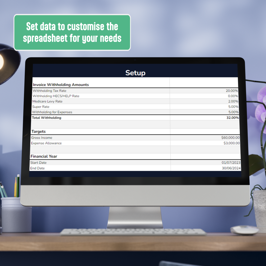 Setup: This sheet is fully customisable to your needs, so you can use the setup page to make the template specific to you. Decide tax rates and any other withholding rates that you need to account for, set targets for income and expenditure and set the start and end date for the financial year you wish to track so you can use this sheet again and again for each subsequent year.